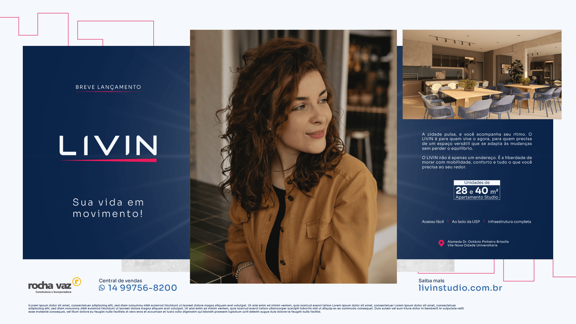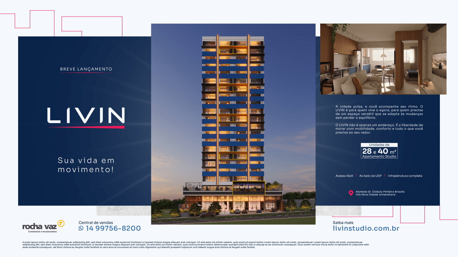 A cidade não para e você também não. O LIVIN nasce para acompanhar quem vive o agora, com liberdade e leveza. Com studios de 28 m² e 40 m², cada detalhe foi pensado para se adaptar ao seu ritmo, sem abrir mão do essencial.