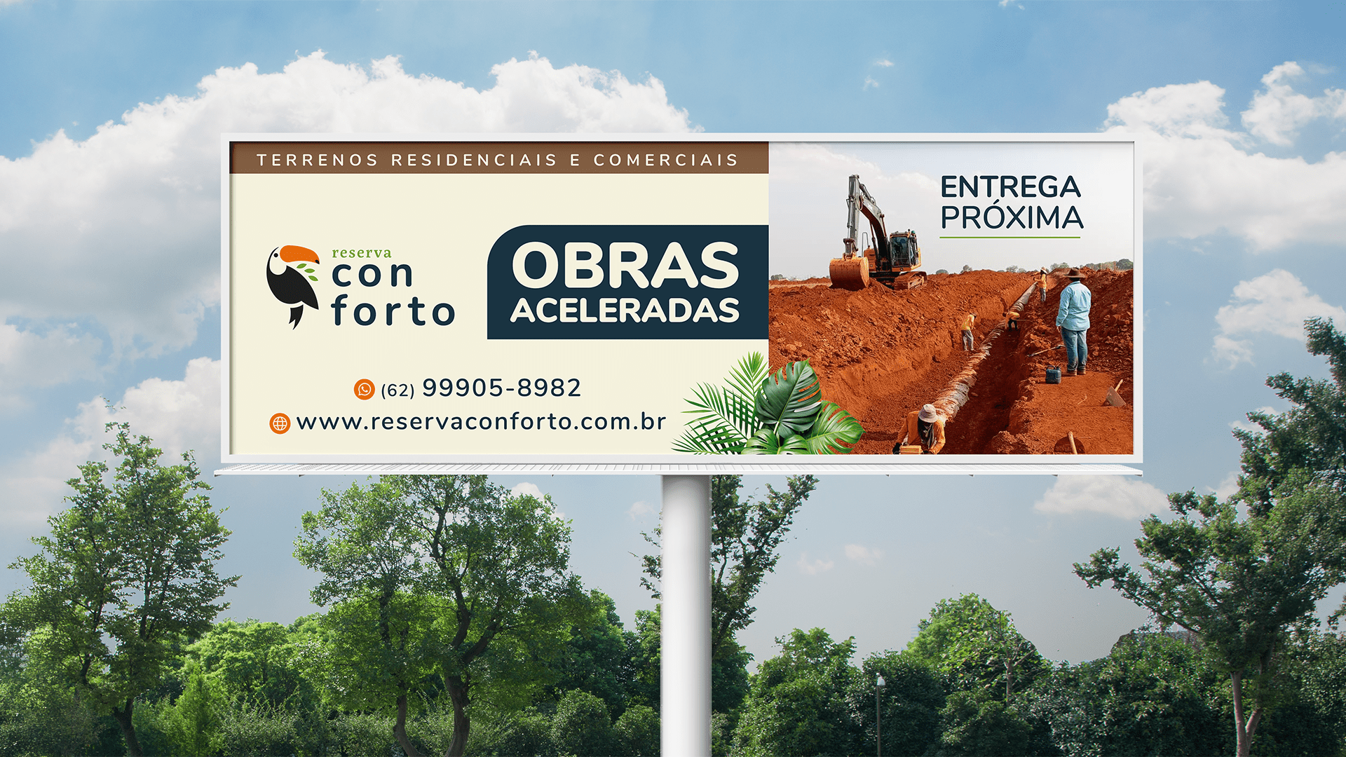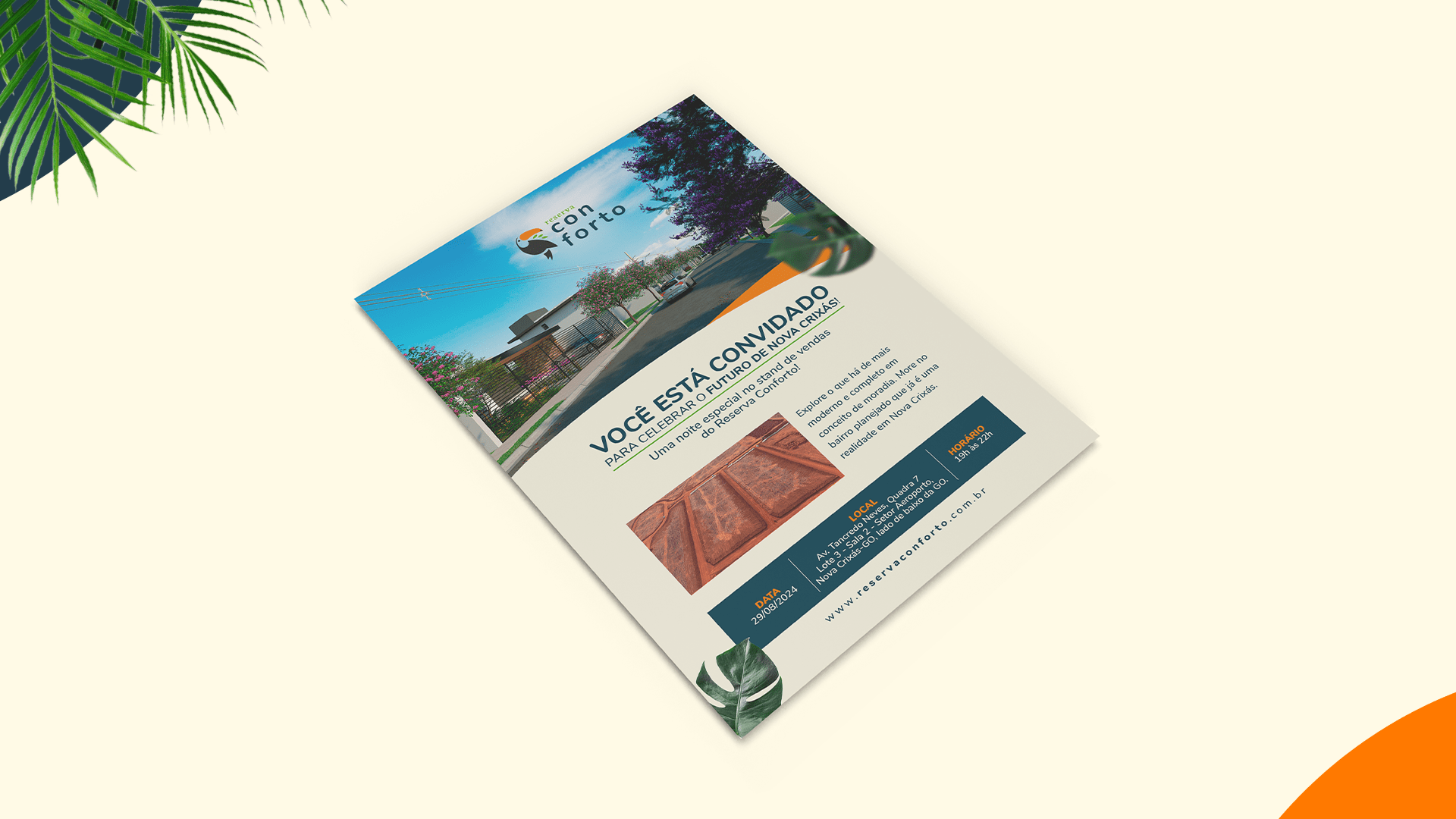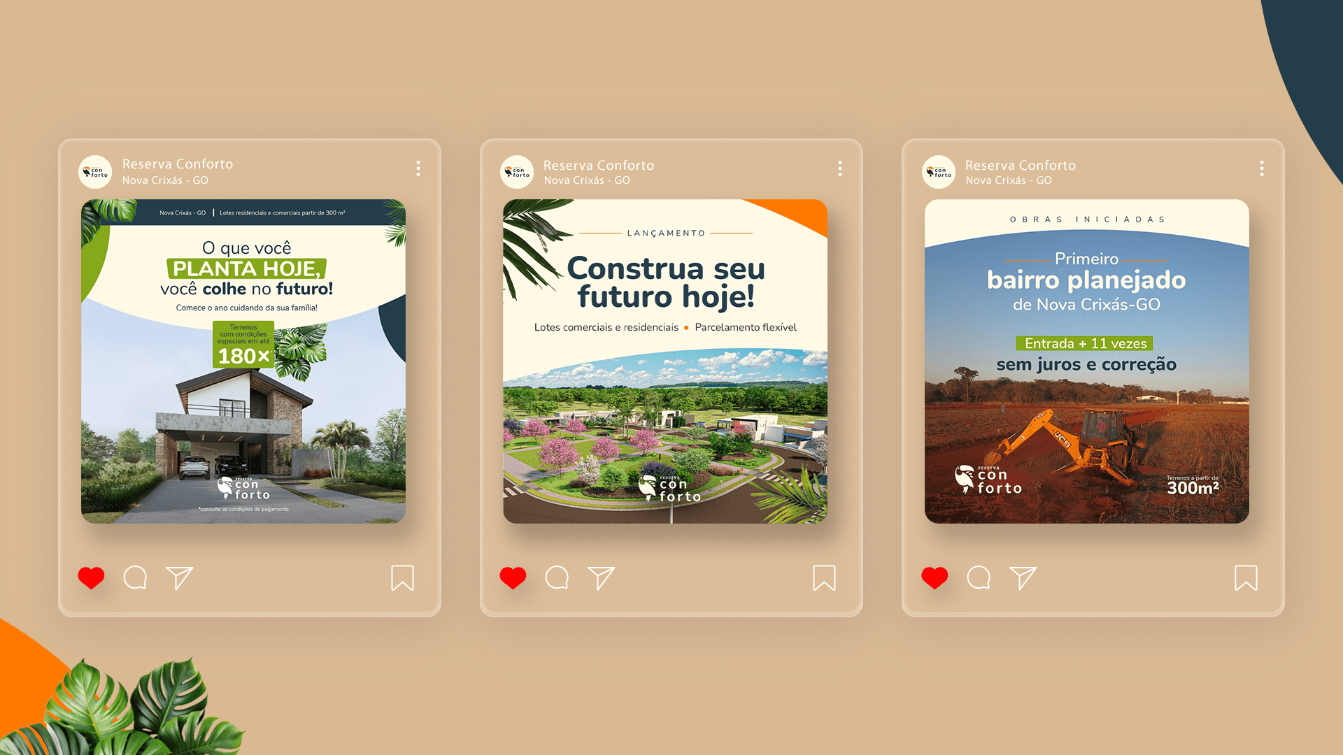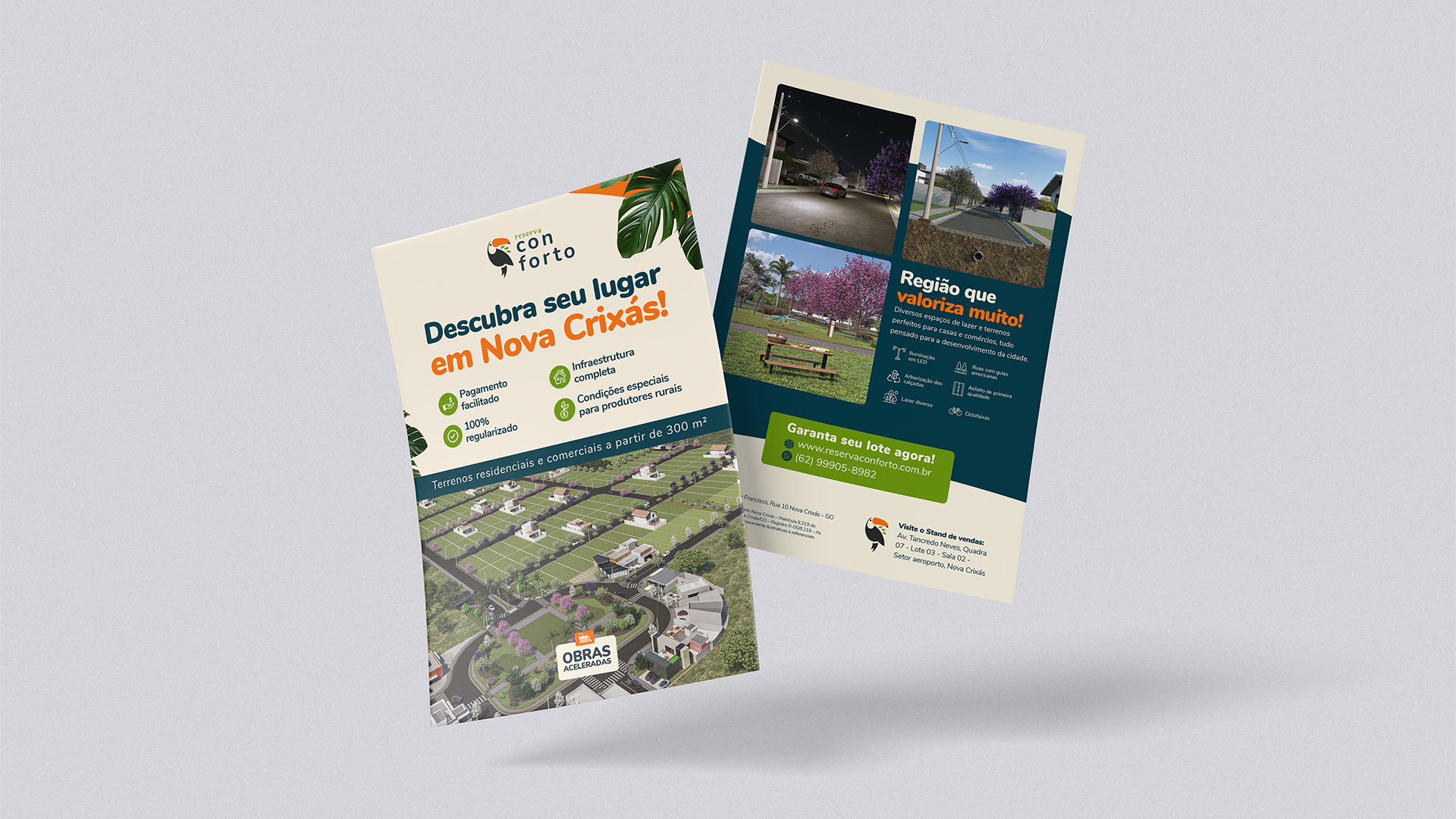 A partir da identidade visual, desenvolvemos todo o ecossistema da marca: materiais digitais e impressos, campanhas de pré-lançamento e lançamento, sinalização das ruas do loteamento e peças de comunicação integradas. O resultado é uma marca viva que conversa com a região e se faz presente na vida de quem mora em Nova Crixás.